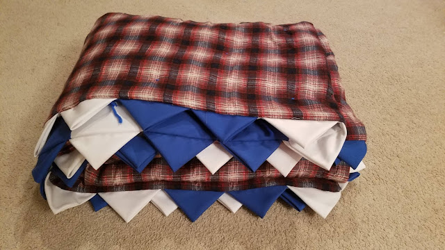 These camp quilts have a fun story. My friend's brother stopped by her house with some treasures he had come across in a garbage dumpster. It was several boxes of precut squares that had been thrown away. The squares are of extremely durable Correttes fabric. It was a company that went out of business in our area many years ago. The fabric lasts forever! Anyway, out of respect for her brother, she is making these bow tie quilts out of the squares. She absolutely insisted that I had to make some too. She even gave me the quilt backing for them and picked up blankets from Walmart for me to put inside for the batting. We didn't want to really spend much money on a get dirty and actually "use" quilt. She has made 12 quilts out of the dumpster fabric already this year. I wasn't too excited at first, but the one I just finished is quite heavy and will definitely keep my family warm on camp trips. I put peekos on the edging and sandwiched the quilt, turned it, then sewed up the hole by hand. It is just tied with blue yarn.