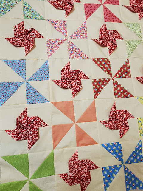 ReplyDeleteYour Cherry Fizz Blooms quilt looks fabulous! And those three dimensional pinwheels sure are cute, too.